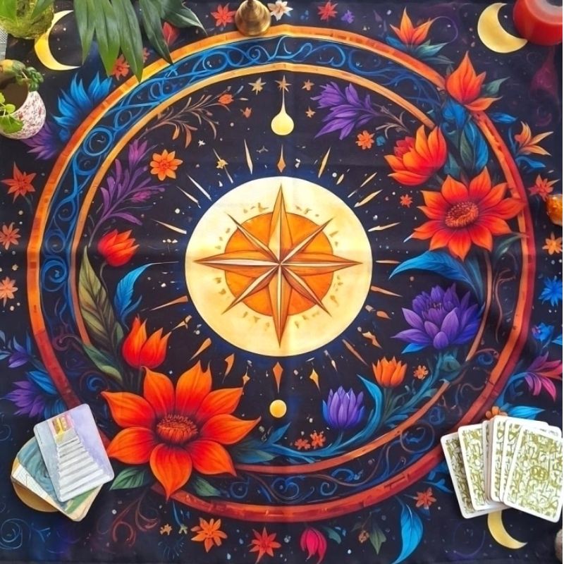 Tiene unas medidas de 70 x 70 cm, lo que lo hace ideal para desplegar tus cartas y realizar lecturas cómodamente aunque también lo podes utilizar para runas, dados, constelaciones, o incluso como mantel o tapiz decorativo.